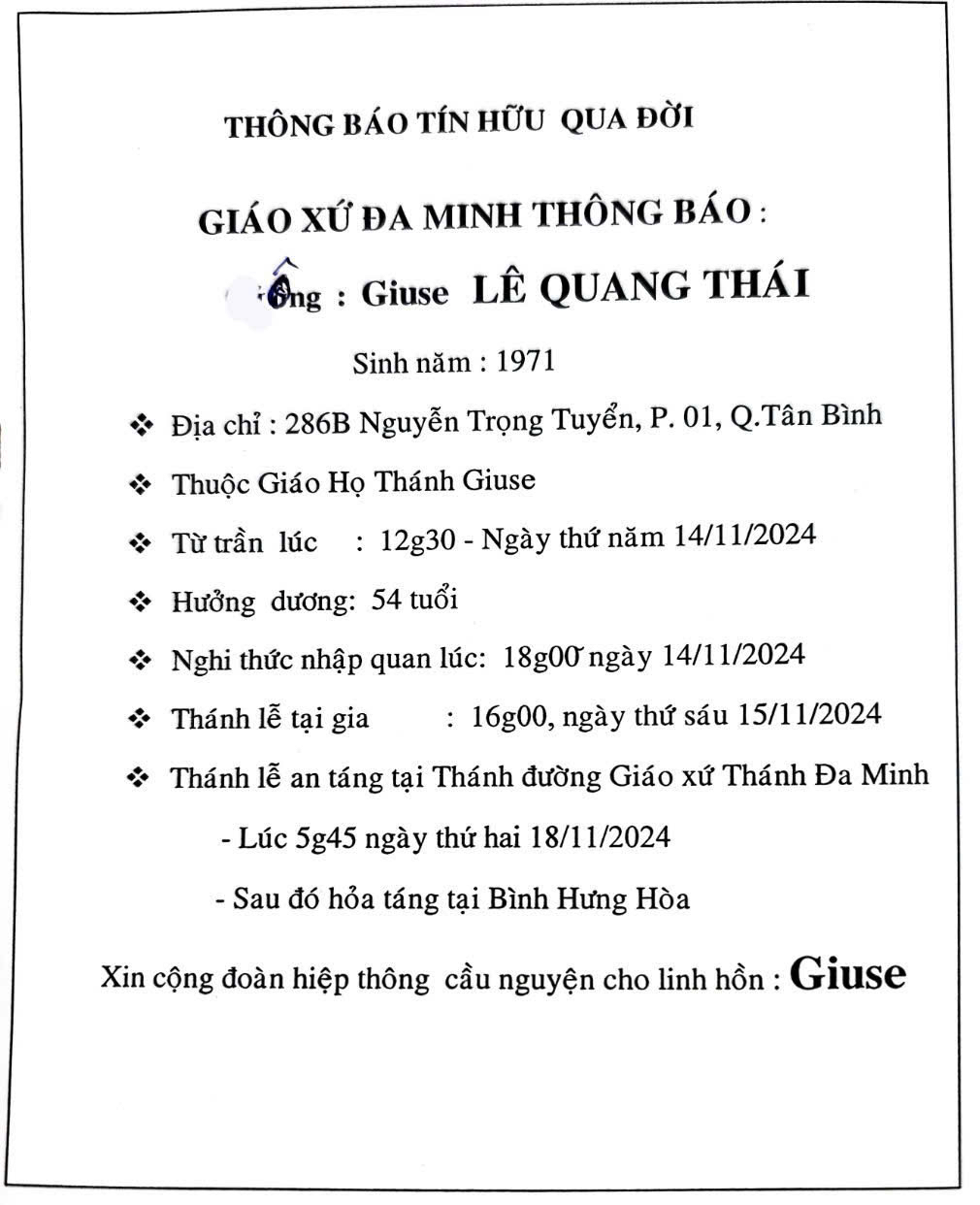 76172 Published 14/11/2024 at 1010 × 1242 in Ai tín, Ông Giuse Lê Quang Thái, thuộc Giáo họ Thánh Giuse, về nhà Cha Next →
