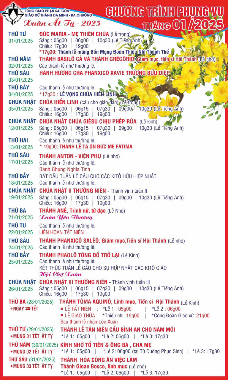 Lịch phụng vụ tháng 1/2025