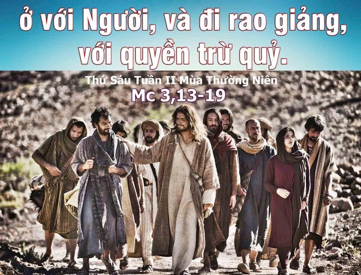 Khi ấy, Đức Giê-su lên núi và gọi những kẻ Người muốn. Các ông đến với Người. Người lập Nhóm Mười Hai, để các ông ở với Người, và để Người sai các ông đi rao giảng, với quyền trừ quỷ. Người lập Nhóm Mười Hai gồm có : ông Si-môn -Người đặt tên là Phê-rô-, ông Gia-cô-bê con ông Dê-bê-đê, và ông Gio-an em ông Gia-cô-bê -Người đặt tên cho hai ông là Bô-a-nê-ghê, nghĩa là con của thiên lôi-, rồi đến các ông An-rê, Phi-líp-phê, Ba-tô-lô-mê-ô, Mát-thêu, Tô-ma, Gia-cô-bê con ông An-phê, Ta-đê-ô, Si-môn thuộc nhóm Nhiệt Thành, và Giu-đa Ít-ca-ri-ốt là chính kẻ nộp Người.