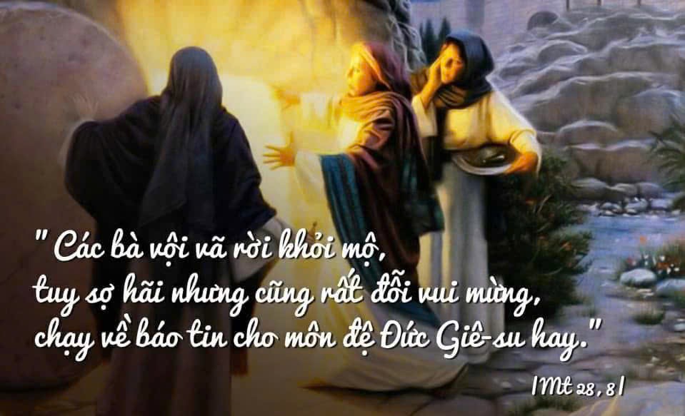 Khi ấy, các người phụ nữ vội vã rời khỏi mộ, tuy sợ hãi nhưng cũng rất đỗi vui mừng, chạy về báo tin cho môn đệ Đức Giê-su hay.
