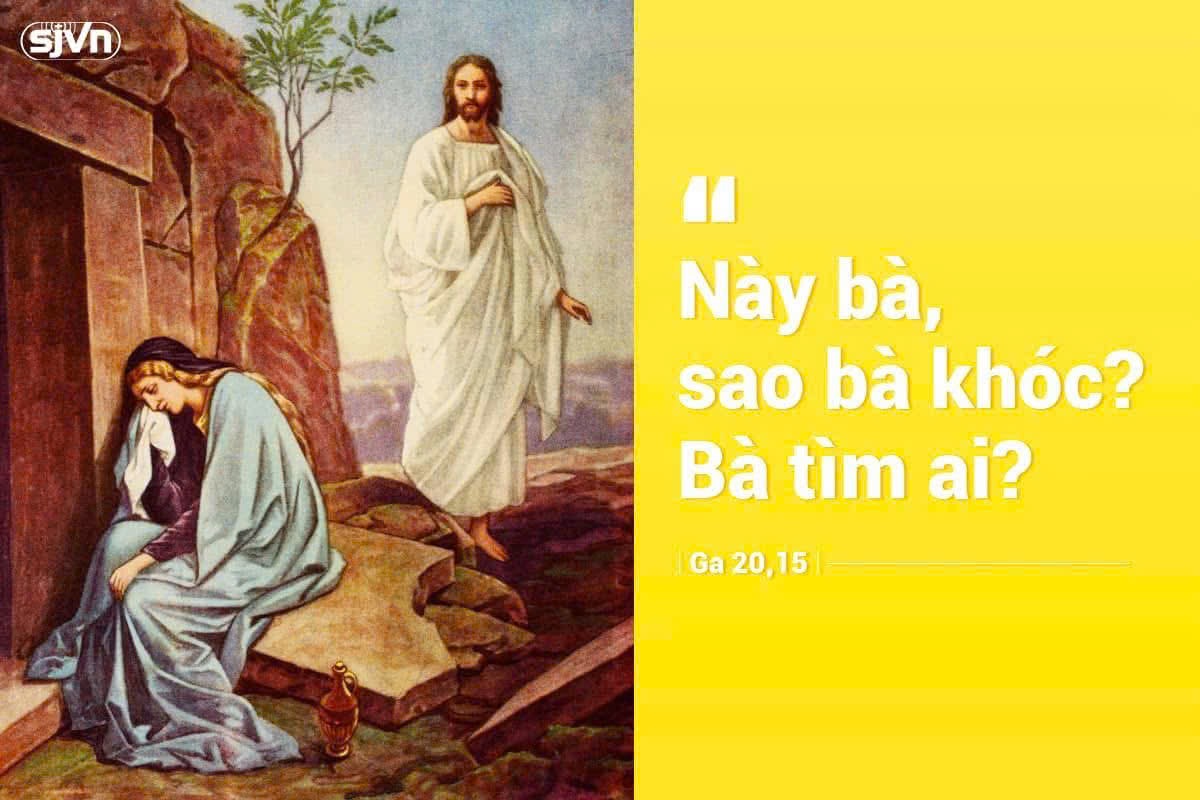 Khi ấy, bà Ma-ri-a Mác-đa-la đứng ở ngoài, gần bên mộ, mà khóc. Bà vừa khóc vừa cúi xuống nhìn vào trong mộ, thì thấy hai thiên thần mặc áo trắng ngồi ở nơi đã đặt thi hài của Đức Giê-su, một vị ở phía đầu, một vị ở phía chân. Thiên thần hỏi bà : “Này bà, sao bà khóc ?” Bà thưa : “Người ta đã lấy mất Chúa tôi rồi, và tôi không biết họ để Người ở đâu !” Nói xong, bà quay lại và thấy Đức Giê-su đứng đó, nhưng bà không biết là Đức Giê-su. Đức Giê-su nói với bà : “Này bà, sao bà khóc ? Bà tìm ai ?” Bà Ma-ri-a tưởng là người làm vườn, liền nói : “Thưa ông, nếu ông đã đem Người đi, thì xin nói cho tôi biết ông để Người ở đâu, tôi sẽ đem Người về.” Đức Giê-su gọi bà : “Ma-ri-a !” Bà quay lại và nói bằng tiếng Híp-ri : “Ráp-bu-ni !” (nghĩa là ‘Lạy Thầy’). Đức Giê-su bảo : “Thôi, đừng giữ Thầy lại, vì Thầy chưa lên cùng Chúa Cha. Nhưng hãy đi gặp anh em Thầy và bảo họ : ‘Thầy lên cùng Cha của Thầy, cũng là Cha của anh em, lên cùng Thiên Chúa của Thầy, cũng là Thiên Chúa của anh em’.” Bà Ma-ri-a Mác-đa-la đi báo cho các môn đệ : “Tôi đã thấy Chúa”, và bà kể lại những điều Người đã nói với bà.
