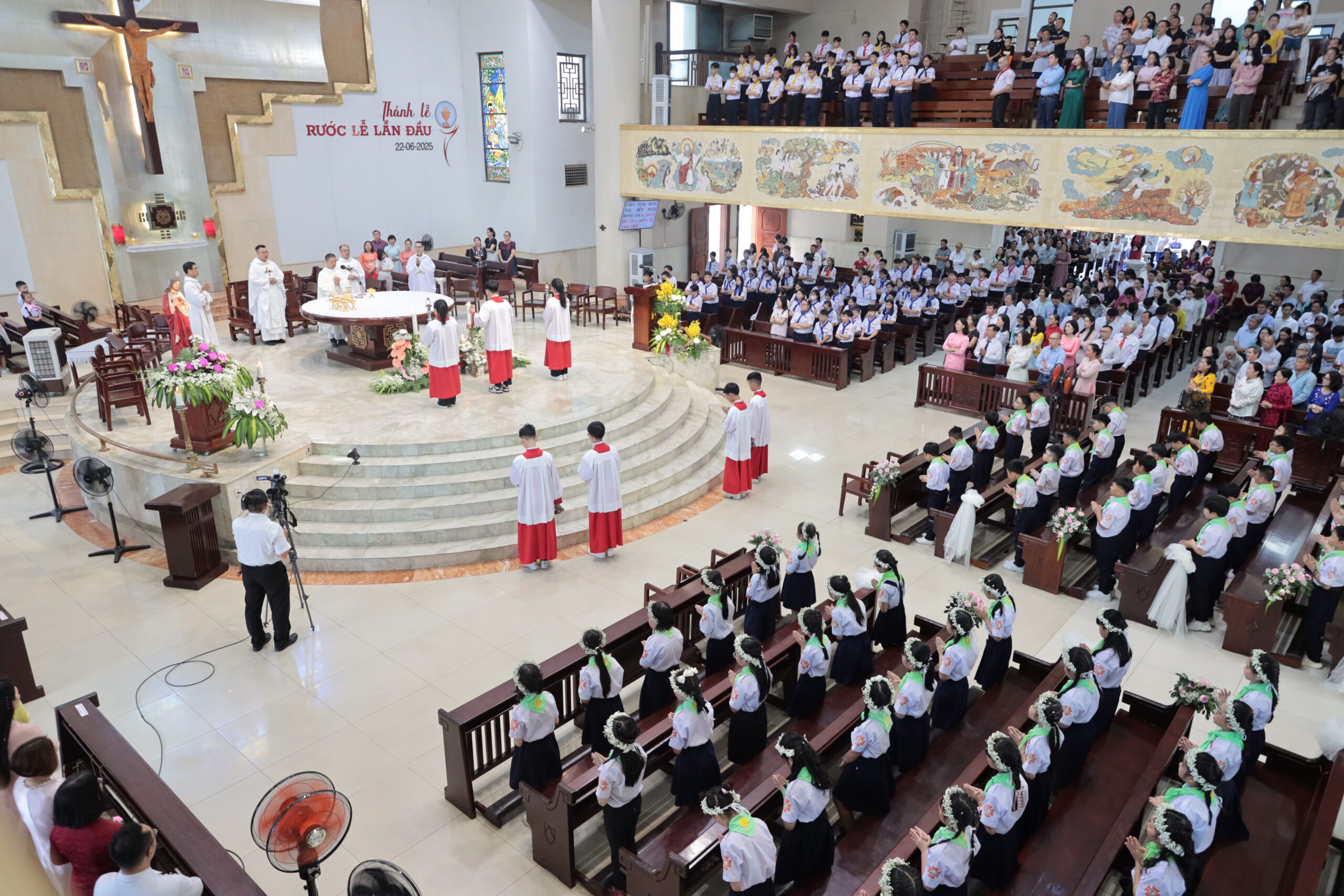 Thánh lễ tiếp tục với phần Phụng vụ Thánh Thể. Sau đó, các em được rước Mình Máu Thánh Chúa trong tâm tình hân hoan, đây là bước ngoặc đánh dấu sự trưởng thành của các em trong đời sống đức tin. Mong rằng các em ngày càng sống thánh thiện, khôn ngoan và đầy đức bác ái trong gia đình, nhà trường và một lòng kiên vững với đức tin mà các em đã lãnh nhận.
