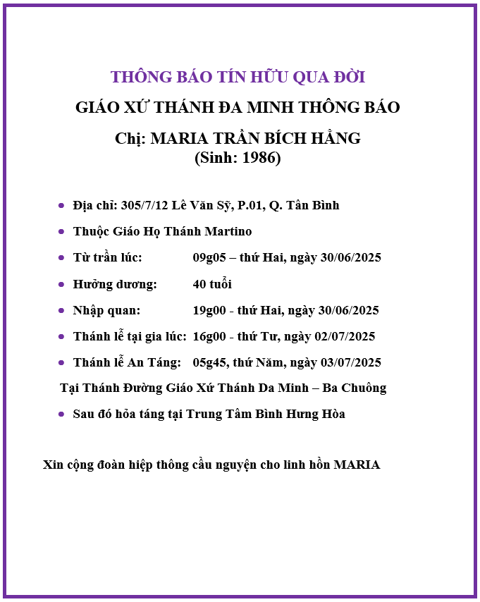 Thông Báo Ai tín, Chị Maria Trần Bích Hằng, thuộc Giáo họ Thánh Martino, về nhà Cha Posted on 30/06/202530/06/2025 by ctvien ctvien 1978 Sáu sự thật không dễ nghe về ly hôn Lịch phụng vụ tháng 7/2025