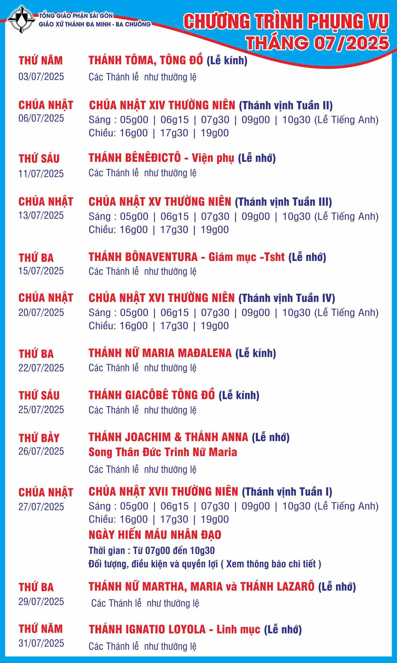 Thông Báo Lịch phụng vụ tháng 7/2025 Posted on 01/07/202528/06/2025 by GX DAMINH 1075 Để giúp cộng đoàn tham dự các cử hành phụng vụ cách tích cực, Ban Truyền Thông xin gửi đến cộng đoàn lịch phụng vụ tháng 7/2025. Ai tín, Chị Maria Trần Bích Hằng, thuộc Giáo họ Thánh Martino, về nhà Cha Ngày 01-07-2025, Thứ Ba, tuần XIII mùa Thường Niên