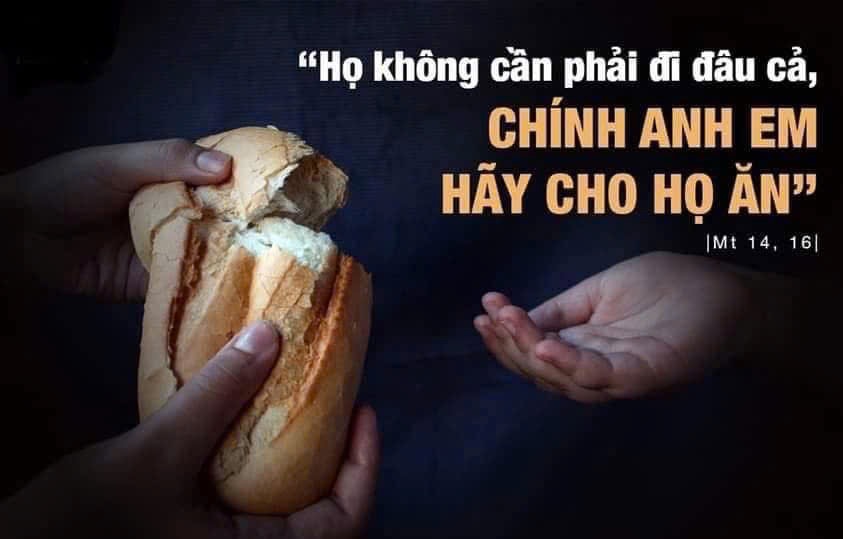 Chúa Giêsu ra lệnh cho các Tông đồ: “Họ không cần phải đi đâu cả, chính các con hãy liệu cho họ ăn”. Chúa không để cho các Tông đồ phải tự sức mình mà lo, Ngài chỉ cần các ông cộng tác và đóng góp những gì có thể, dù chỉ là một phần nhỏ so với nhu cầu bao la. Chỉ với 5 chiếc bánh và 2 con cá, Chúa đã thực hiện phép lạ nuôi sống 5000 đàn ông, không kể đàn bà và con trẻ.