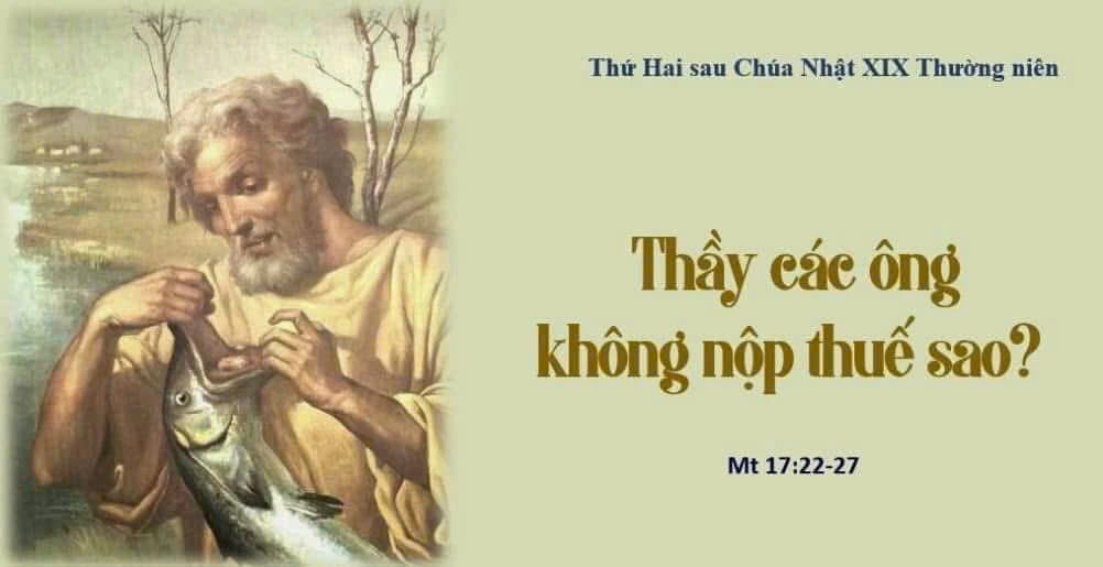 Khi thầy trò tới Ca-phác-na-um, thì những người thu thuế cho đền thờ đến hỏi ông Phê-rô : “Thầy các ông không nộp thuế sao ?” Ông đáp : “Có chứ !” Ông về tới nhà, Đức Giê-su hỏi đón ông : “Anh Si-môn, anh nghĩ sao ? Vua chúa trần gian bắt ai đóng sưu nộp thuế ? Con cái mình hay người ngoài ?” Ông Phê-rô đáp : “Thưa, người ngoài.” Đức Giê-su liền bảo : “Vậy thì con cái được miễn. Nhưng để khỏi làm cớ cho họ sa ngã, anh hãy ra biển thả câu ; con cá nào câu được trước hết, thì bắt lấy, mở miệng nó ra : anh sẽ thấy một đồng tiền bốn quan ; anh lấy đồng tiền ấy, nộp thuế cho họ, phần của Thầy và phần của anh.”