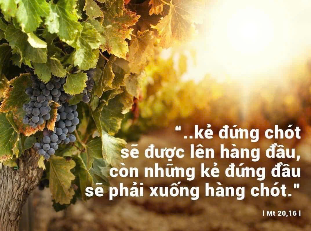 Khi ấy, Đức Giê-su kể cho các môn đệ nghe dụ ngôn này : “Nước Trời giống như chuyện chủ nhà kia, vừa tảng sáng đã ra mướn thợ vào làm việc trong vườn nho của mình. Sau khi đã thoả thuận với thợ là mỗi ngày một quan tiền, ông sai họ vào vườn nho làm việc. Khoảng giờ thứ ba, ông trở ra, thấy có những người khác ở không, đang đứng ngoài chợ. Ông cũng bảo họ : ‘Cả các anh nữa, hãy đi vào vườn nho, tôi sẽ trả cho các anh hợp lẽ công bằng.’ Họ liền đi. Khoảng giờ thứ sáu, rồi giờ thứ chín, ông lại trở ra và cũng làm y như vậy. Khoảng giờ mười một, ông trở ra và thấy còn có những người khác đứng đó, ông nói với họ : ‘Sao các anh đứng đây suốt ngày không làm gì hết ?’ Họ đáp : ‘Vì không ai mướn chúng tôi.’ Ông bảo họ : ‘Cả các anh nữa, hãy đi vào vườn nho !’ Chiều đến, ông chủ vườn nho bảo người quản lý : ‘Anh gọi thợ lại mà trả công cho họ, bắt đầu từ những người vào làm sau chót tới những người vào làm trước nhất.’ Vậy những người mới vào làm lúc giờ mười một tiến lại, và lãnh được mỗi người một quan tiền. Khi đến lượt những người vào làm trước nhất, họ tưởng sẽ được lãnh nhiều hơn, thế nhưng cũng chỉ lãnh được mỗi người một quan tiền. Họ vừa lãnh vừa cằn nhằn chủ nhà : ‘Mấy người sau chót này chỉ làm có một giờ, thế mà ông lại coi họ ngang hàng với chúng tôi là những người đã phải làm việc nặng nhọc cả ngày, lại còn bị nắng nôi thiêu đốt.’ Ông chủ trả lời cho một người trong bọn họ : ‘Này bạn, tôi đâu có xử bất công với bạn. Bạn đã chẳng thoả thuận với tôi là một quan tiền sao ? Cầm lấy phần của bạn mà đi đi. Còn tôi, tôi muốn cho người vào làm sau chót này cũng được bằng bạn đó. Chẳng lẽ tôi lại không có quyền tuỳ ý định đoạt về những gì là của tôi sao ? Hay vì thấy tôi tốt bụng, mà bạn đâm ra ghen tức ?’ Thế là những kẻ đứng chót sẽ được lên hàng đầu, còn những kẻ đứng đầu sẽ phải xuống hàng chót.”