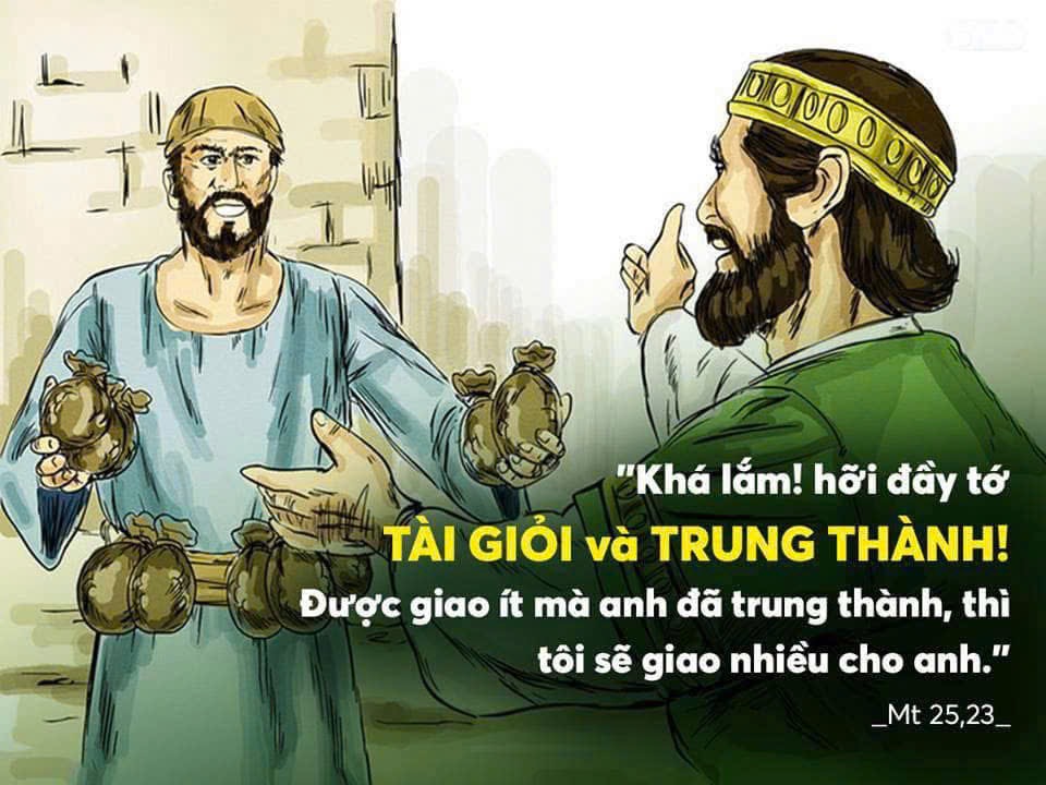 Khi ấy, Đức Giê-su kể cho các môn đệ nghe dụ ngôn này : “Người kia sắp đi xa, gọi đầy tớ đến mà giao phó của cải mình cho họ. Ông đưa cho người này năm yến, người kia hai yến, người khác nữa một yến, tuỳ khả năng riêng mỗi người. Rồi ông ra đi. Lập tức, người đã lãnh năm yến lấy số tiền ấy đi làm ăn, và gây lời được năm yến khác. Cũng vậy, người đã lãnh hai yến gây lời được hai yến khác. Còn người đã lãnh một yến thì đi đào lỗ chôn giấu số bạc của chủ. Sau một thời gian lâu dài, ông chủ các đầy tớ ấy đến và yêu cầu họ thanh toán sổ sách. Người đã lãnh năm yến tiến lại gần, đưa năm yến khác, và nói : ‘Thưa ông chủ, ông đã giao cho tôi năm yến, tôi đã gây lời được năm yến khác đây.’ Ông chủ nói với người ấy : ‘Khá lắm ! Anh đúng là tôi tớ tài giỏi và trung thành ! Được giao ít mà anh đã trung thành, thì tôi sẽ giao nhiều cho anh. Hãy vào mà hưởng niềm vui của chủ anh !’ Người đã lãnh hai yến cũng tiến lại gần và nói : ‘Thưa ông chủ, ông đã giao cho tôi hai yến, tôi đã gây lời được hai yến khác đây.’ Ông chủ nói với người ấy : ‘Khá lắm ! Anh đúng là tôi tớ tài giỏi và trung thành ! Được giao ít mà anh đã trung thành, thì tôi sẽ giao nhiều cho anh. Hãy vào mà hưởng niềm vui của chủ anh !’ Rồi người đã lãnh một yến cũng tiến lại gần và nói : ‘Thưa ông chủ, tôi biết ông là người hà khắc, gặt chỗ không gieo, thu nơi không vãi. Vì thế, tôi đâm sợ, mới đem chôn giấu yến bạc của ông dưới đất. Của ông vẫn còn nguyên đây này !’ Ông chủ đáp : ‘Anh thật là tôi tớ xấu xa và biếng nhác ! Anh đã biết tôi gặt chỗ không gieo, thu nơi không vãi, thì đáng lý anh phải gửi số bạc của tôi vào ngân hàng, để khi tôi đến, tôi thu được cả vốn lẫn lời chứ ! Vậy các ngươi hãy lấy yến bạc khỏi tay nó mà đưa cho người đã có mười yến. Vì phàm ai đã có, thì được cho thêm và sẽ có dư thừa ; còn ai không có, thì ngay cái đang có, cũng sẽ bị lấy đi. Còn tên đầy tớ vô dụng kia, hãy quăng nó ra chỗ tối tăm bên ngoài : ở đó, người ta sẽ phải khóc lóc nghiến răng’.”