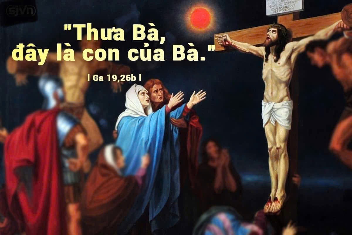 Khi ấy, đứng gần thập giá Đức Giê-su, có thân mẫu Người, chị của thân mẫu, bà Ma-ri-a vợ ông Cơ-lô-pát, cùng với bà Ma-ri-a Mác-đa-la. Khi thấy thân mẫu và môn đệ mình thương mến đứng bên cạnh, Đức Giê-su nói với thân mẫu rằng : “Thưa Bà, đây là con của Bà.” Rồi Người nói với môn đệ : “Đây là mẹ của anh.” Kể từ giờ đó, người môn đệ rước bà về nhà mình.
