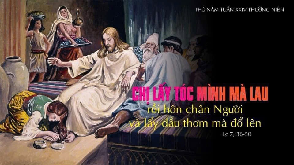 Rồi quay lại phía người phụ nữ, Người nói với ông Si-môn : “Ông thấy người phụ nữ này chứ ? Tôi vào nhà ông : nước lã, ông cũng không đổ lên chân tôi, còn chị ấy đã lấy nước mắt tưới ướt chân tôi, rồi lấy tóc mình mà lau. Ông đã chẳng hôn tôi một cái, còn chị ấy từ lúc vào đây, đã không ngừng hôn chân tôi. Dầu ô-liu, ông cũng không đổ lên đầu tôi, còn chị ấy thì lấy dầu thơm mà đổ lên chân tôi. Vì thế, tôi nói cho ông hay : tội của chị rất nhiều, nhưng đã được tha, bằng cớ là chị đã yêu mến nhiều. Còn ai được tha ít thì yêu mến ít.” Rồi Đức Giê-su nói với người phụ nữ : “Tội của chị đã được tha rồi.” Bấy giờ những người đồng bàn liền nghĩ bụng : “Ông này là ai mà lại tha được tội ?” Nhưng Đức Giê-su nói với người phụ nữ : “Lòng tin của chị đã cứu chị. Chị hãy đi bình an.”