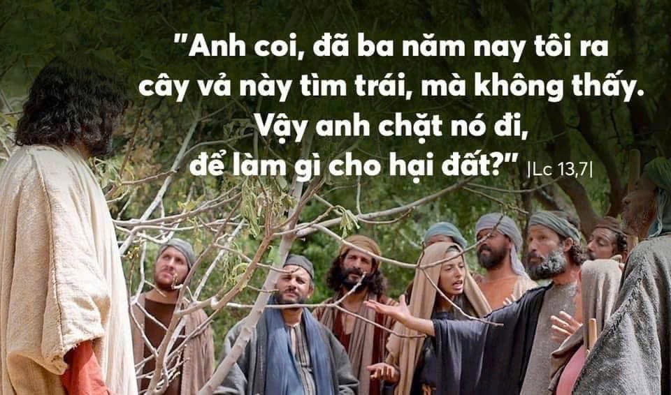 Rồi Đức Giê-su kể dụ ngôn này : “Người kia có một cây vả trồng trong vườn nho mình. Bác ta ra cây tìm trái mà không thấy, nên bảo người làm vườn : ‘Anh coi, đã ba năm nay tôi ra cây vả này tìm trái, mà không thấy. Vậy anh chặt nó đi, để làm gì cho hại đất ?’ Nhưng người làm vườn đáp : ‘Thưa ông, xin cứ để nó lại năm nay nữa. Tôi sẽ vun xới chung quanh, và bón phân cho nó. May ra sang năm nó có trái, nếu không thì ông sẽ chặt nó đi’.”