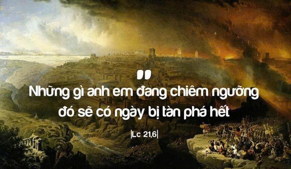 Hình ảnh Đền thờ Giêrusalem được Hêrôđê Cả cho tái thiết lại trang hoàng lộng lẫy và lóng lánh ngọc thạch. Mọi người tự hào và trầm trồ khen ngợi. Nhưng đúng như những gì Tin mừng loan báo, thành Giêrusalem đã bị tướng Titus của Rôma phóng hỏa và bình địa xoá sổ vào năm 70 và dân Do thái tản mác khắp nơi trên địa cầu. Với cách diễn tả của các tác giả Tin mừng, các ngài thường liên tưởng đến biến cố Giêrusalem và biến cố cánh chung. Và rồi, bao nhiêu công trình mà con người tự hào và khen ngợi, từ công trình khoa học kỹ thuật đến các công trình kiến trúc… rồi sẽ trở thành tro bụi khi ngày tận thế đến.