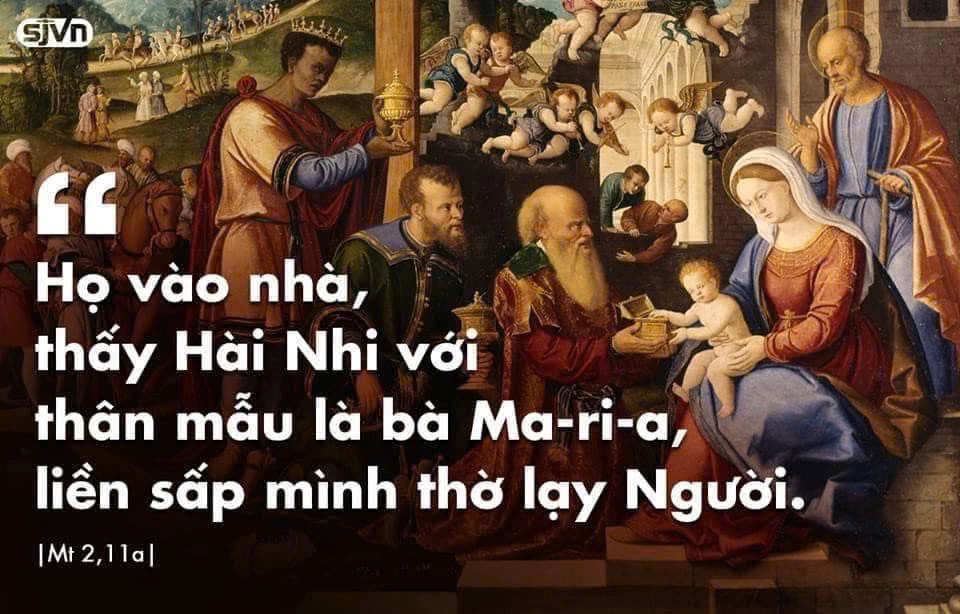 Bấy giờ vua Hê-rô-đê bí mật vời các nhà chiêm tinh đến, hỏi cặn kẽ về ngày giờ ngôi sao đã xuất hiện. Rồi vua phái các vị ấy đi Bê-lem và dặn rằng : “Xin quý ngài đi dò hỏi tường tận về Hài Nhi, và khi đã tìm thấy, xin báo lại cho tôi, để tôi cũng đến bái lạy Người.” Nghe nhà vua nói thế, họ ra đi. Bấy giờ ngôi sao họ đã thấy ở phương Đông, lại dẫn đường cho họ đến tận nơi Hài Nhi ở, mới dừng lại. Trông thấy ngôi sao, họ mừng rỡ vô cùng. Họ vào nhà, thấy Hài Nhi với thân mẫu là bà Ma-ri-a, liền sấp mình thờ lạy Người. Rồi họ mở bảo tráp, lấy vàng, nhũ hương và một dược mà dâng tiến. Sau đó, họ được báo mộng là đừng trở lại gặp vua Hê-rô-đê nữa, nên đã đi lối khác mà về xứ mình.