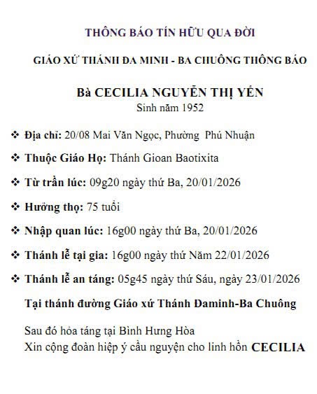 Thông Báo Ai tín, Bà CECILIA NGUYỄN THỊ YẾN, thuộc Giáo họ Thánh Gioan Baotixita, về nhà Cha Posted on 20/01/2026 by GX DAMINH 10 Ngày 20-01-2026, Thứ Ba Tuần II – Mùa Thường Niên