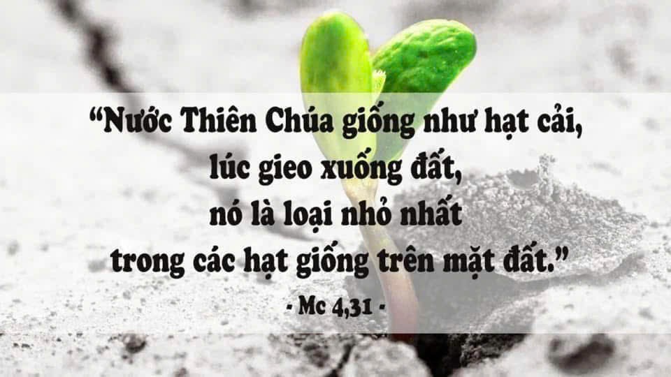 Rồi Người lại nói : “Chúng ta ví Nước Thiên Chúa với cái gì đây ? Lấy dụ ngôn nào mà hình dung được ? Nước Thiên Chúa giống như hạt cải, lúc gieo xuống đất, nó là loại nhỏ nhất trong các hạt giống trên mặt đất. Nhưng khi gieo rồi, thì nó mọc lên lớn hơn mọi thứ rau cỏ, cành lá xum xuê, đến nỗi chim trời có thể làm tổ dưới bóng.”