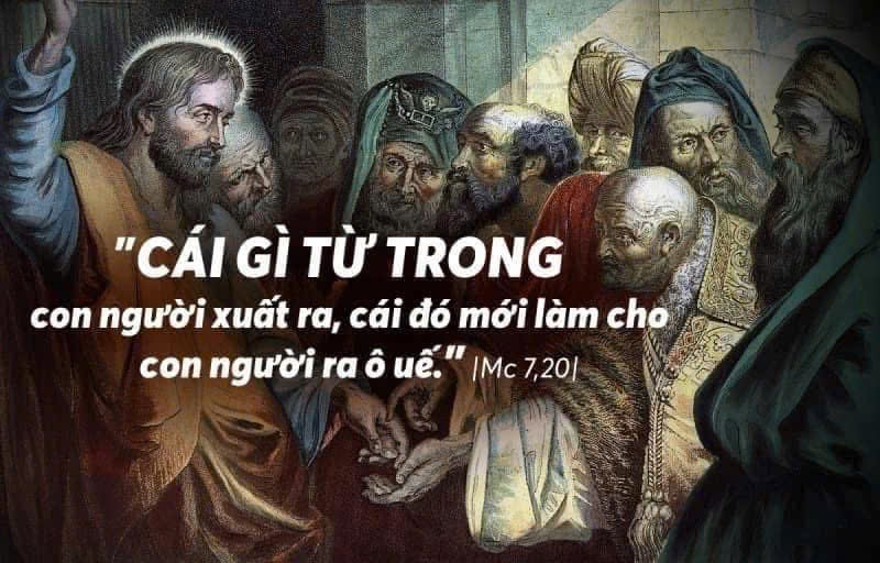 Khi Đức Giê-su đã rời đám đông mà vào nhà, các môn đệ hỏi Người về dụ ngôn ấy. Người nói với các ông : “Cả anh em nữa, anh em cũng ngu tối như thế sao ? Anh em không hiểu sao ? Bất cứ cái gì từ bên ngoài vào trong con người, thì không thể làm cho con người ra ô uế, bởi vì nó không đi vào lòng, nhưng vào bụng người ta, rồi bị thải ra ngoài ?” Như vậy là Người tuyên bố mọi thức ăn đều thanh sạch. Người nói : “Cái gì từ trong con người xuất ra, cái đó mới làm cho con người ra ô uế. Vì từ bên trong, từ lòng người, phát xuất những ý định xấu : tà dâm, trộm cắp, giết người, ngoại tình, tham lam, độc ác, xảo trá, trác táng, ganh tỵ, phỉ báng, kiêu ngạo, ngông cuồng. Tất cả những điều xấu xa đó, đều từ bên trong xuất ra, và làm cho con người ra ô uế.”