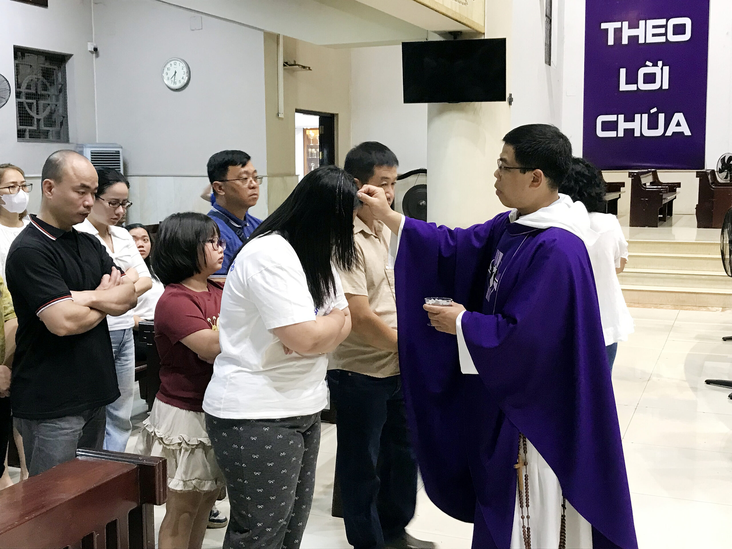 Trong phần chia sẻ lời Chúa, cha Gioan gợi mở cùng cộng đoàn những tiện ích, thông tin chỉ nằm gọn trong chiếc điện thoại. Điều đó khiến chúng ta rơi vào trạng thái ảo tưởng có thể kiểm soát mọi thứ, thậm chí “tự cứu độ” mình. Thế giới hiện nay đã quá đề cao về hình ảnh, sự thành công thì ngày hôm nay, Hội Thánh mời gọi chúng ta bước vào Mùa Chay bằng nghi thức xức Tro, nghi thức này nhắc nhở chúng ta rằng con người được tạo nên từ bụi đất, rồi mai này cũng trở về bụi đất mà thôi, sâu xa ý nghĩa của việc xức Tro thức tỉnh chúng ta về thân phận thụ tạo hữu hạn.