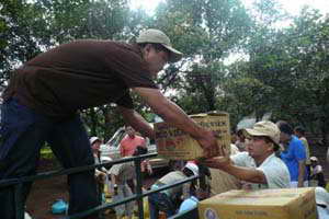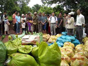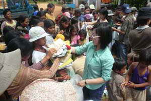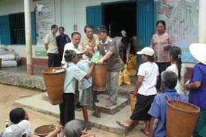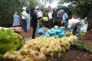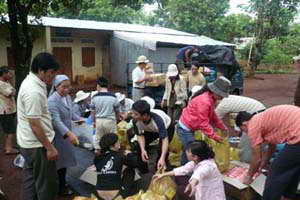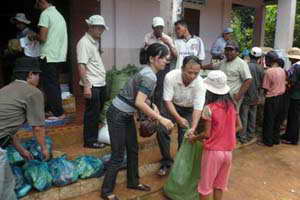 đoàn đă phát cho các gia đình những phần quà gồm gạo, mì