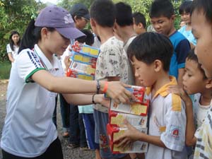 một thành viên trong nhóm bước lại đưa bánh cho bệnh