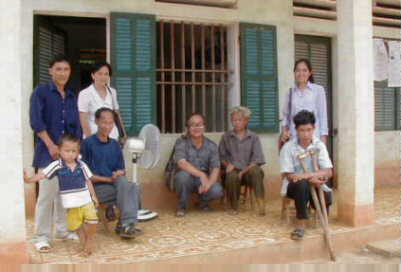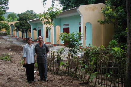 Tiếp chúng tôi, có anh Tuấn chủ tịch hội đồng bệnh nhân, cùng một số nhân viên của trại. Sau khi trao đổi, hỏi han tình hình của Trại, chúng tôi được các anh dẫn đi thăm một số khu nhà trong trại. Ðặc biệt là dãy nhà trại mới xây cho bệnh nhân. Tỉnh Dòng đã yểm trợ hai trong số sáu căn nhà này, mỗi căn 23 triệu đồng. Và tài trợ thêm 3,5 triệu để làm con đường xi măng nối liền các căn nhà. Dãy nhà mới đã được nghiệm thu cuối tháng sáu, và các gia đình sẽ dọn ra ở vào ngày mai 9-7-2002. Chúng tôi tranh thủ chụp hình hai gia đình với căn nhà cũ và mới của họ.